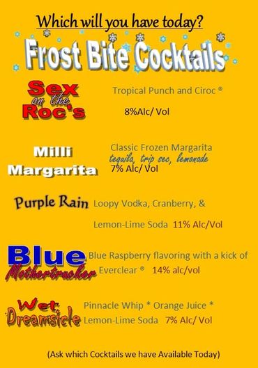 We have had a mixologist concoct some of the best tasting frozen mixed-drinks you've ever tasted: 6 different liquor cocktails from which to choose and more in development. Order today!